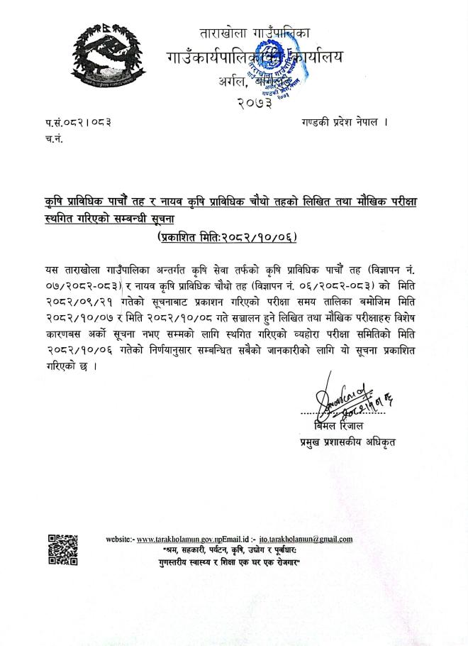 कृषि प्राविधिक पाँचौ तह र नायक कृषि प्राविधिक चोथौ तहको लिखित तथा मौखिक परिक्षा स्थगित गरिएको सम्बन्धि सूचना