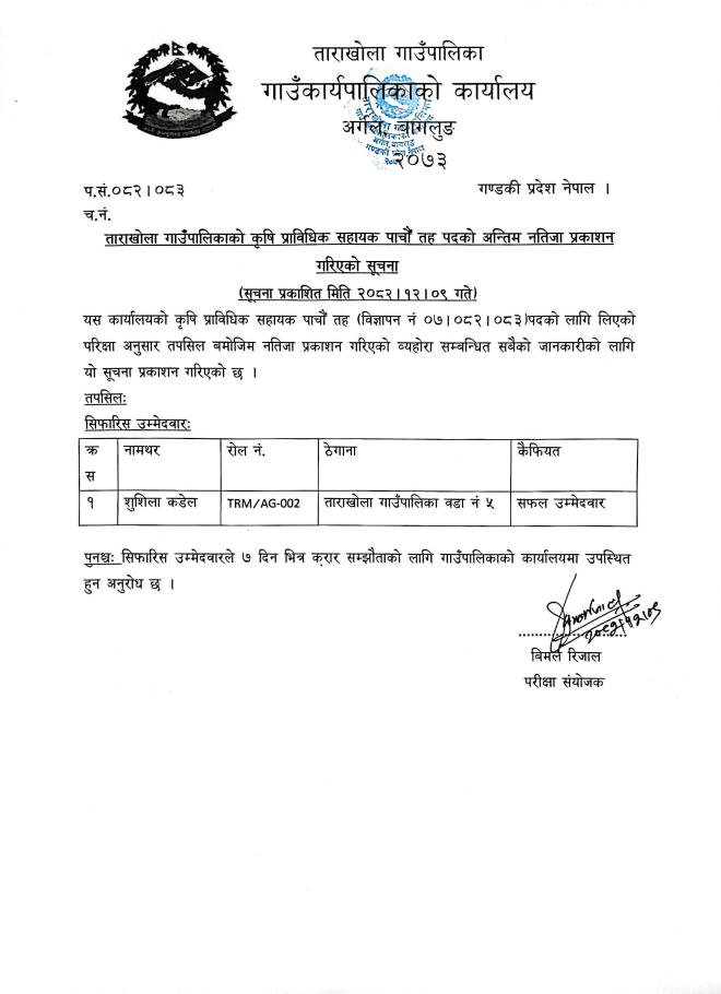 कृषी प्राविधिक सहायक पाँचौ तह पदको अन्तिम नतिजा प्रकाशन गरिएको सूचना ।