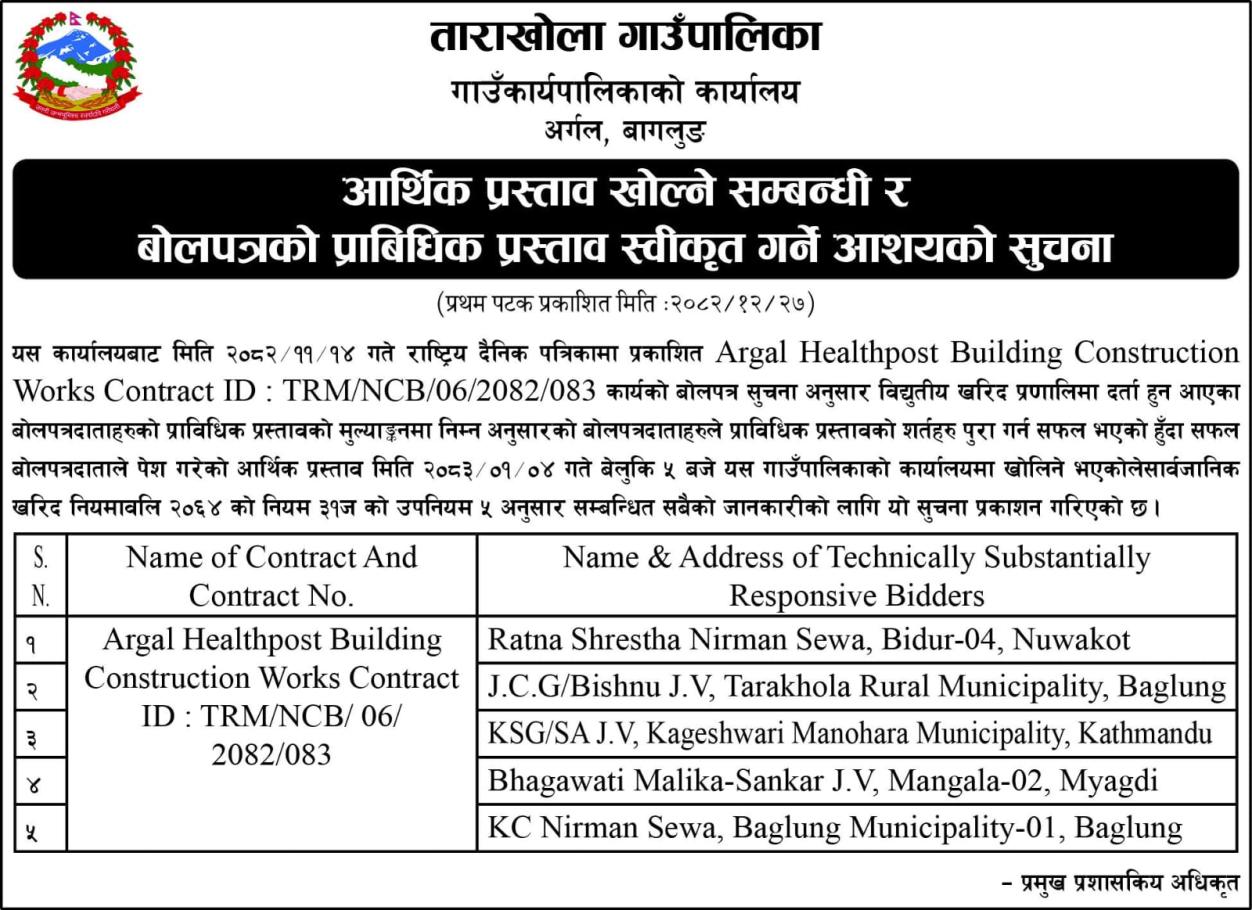 बोलपत्र स्वीकृत गर्ने आश्यको सूचना