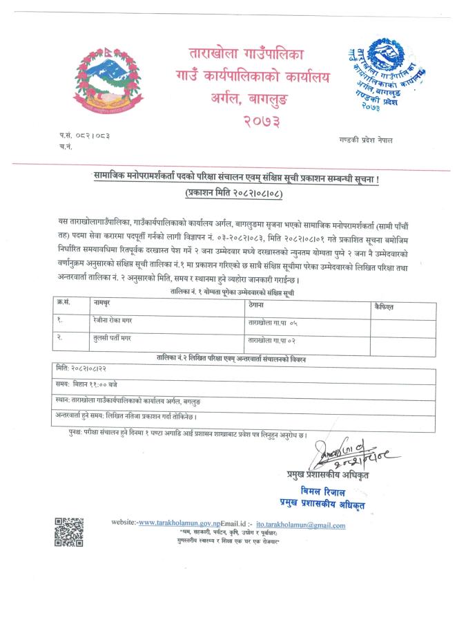 सामाजिक मनोपरामर्शकर्ता पदको परिक्षा संचालन एवम संक्षिप्त सूची प्रकाशन सम्बन्धी सूचना