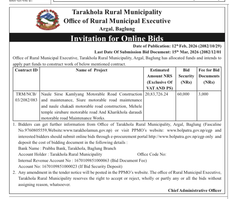 INVITATION FOR ONLINE BIDS ( SIRKHU PATALE MOTORABLE ROAD EXCAVATION)