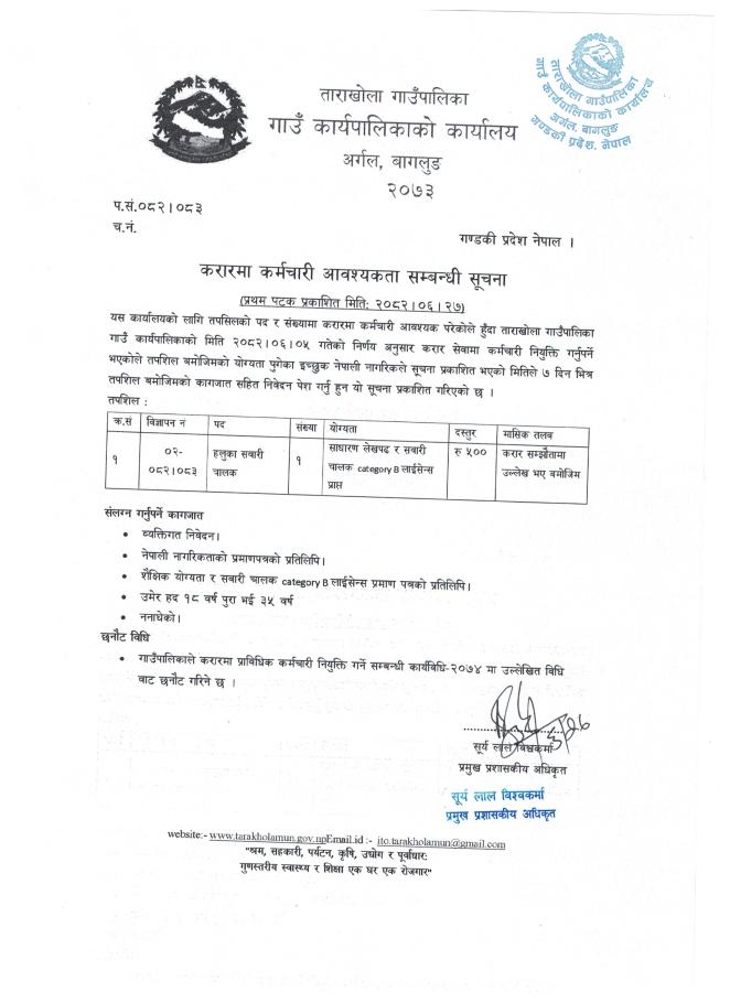 करारमा कर्मचारी आवश्यकता सम्बन्धी सूचना ।