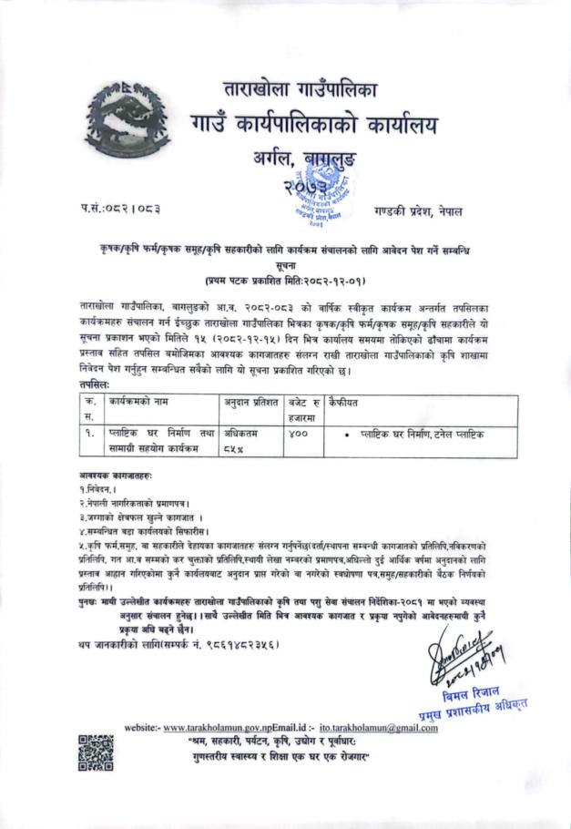 कृषक/कृषि फर्म/कृषक समुह/कृषी सहकारीको लागि कार्यक्रम संचालनको लागि आवेदन पेश गर्ने सम्बन्धी सूचना