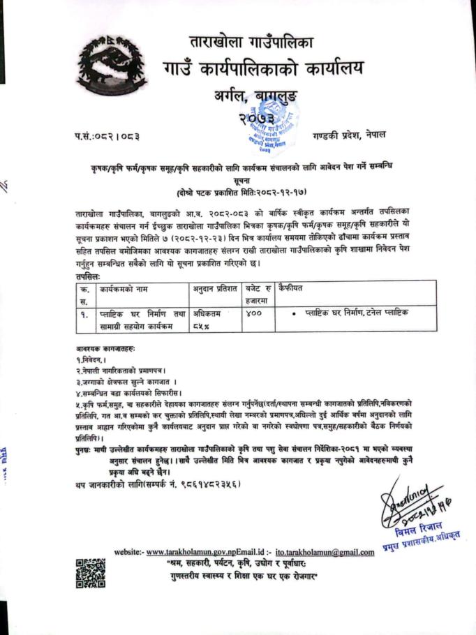 कृषक/कृषी फर्म/ कृषक समुह/ कृषी सहकारीको लागि कार्यक्रम संचालनको लागि आवेदन पेश गर्ने सम्बन्धी सूचना ।