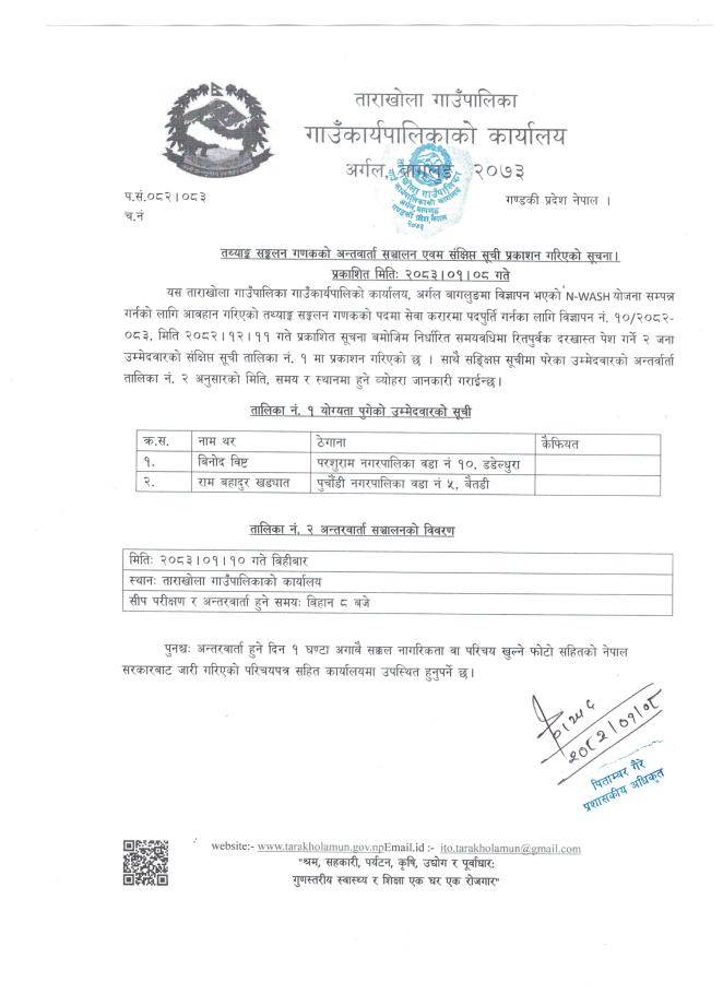 WASH PLAN तथ्याङ्क सङ्कलन गणकको अन्तवार्ता सञ्चालन एवम संक्षिप्त सूची प्रकाशन गरिएको सूचना